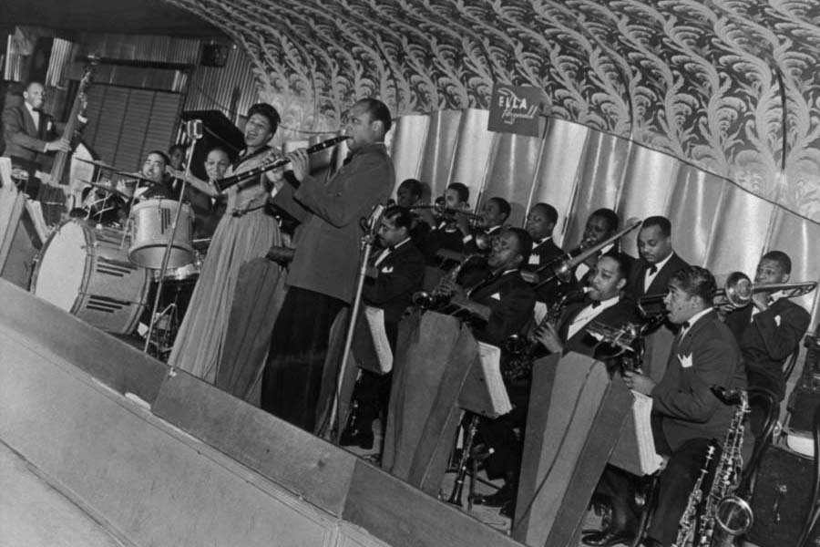 1941 – Ella Fitzgerald Orchestra on the Savoy bandstand. Looking towards the 141st Street rear corner, by Frank Driggs Collection, Magnum Photos