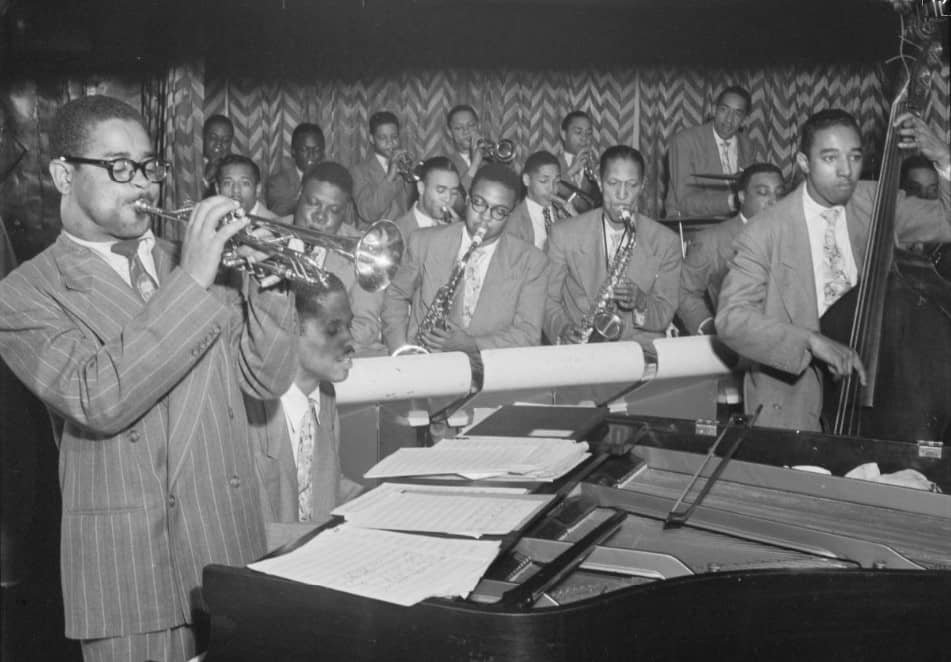 Dizzy Gillespie, John Lewis, Cecil Payne, Miles Davis and Ray Brown (among others) depicted in a 1917 photograph by William P. Gottlieb