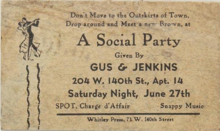 Because of rising rents due to the housing crisis, some people decided to organize parties with an entrance fee of about 25 cents (which, corrected for inflation would be about $4.45 nowadays) where, for a little extra money, people could get to have some home-made fried food, and loads of alcohol, but most of all… they could dance to piano music or bands. It gave people a chance to cut loose after a hard work week, it gave the hosts the ability to pay the rent, it let you enjoy the newest music, it was a cheap way to get a home-cooked meal (way cheaper than going to a club) and of course it gave you access to alcohol, which was illegal due to the prohibition. Which is also why these parties were kept a secret, by using business cards and leaflets as tickets that had quirky rhymes or euphemisms, without explicitly identifying the event as a rent party. Usually they would be called “Social Parties” or “Social Dances” to try to avoid the police.